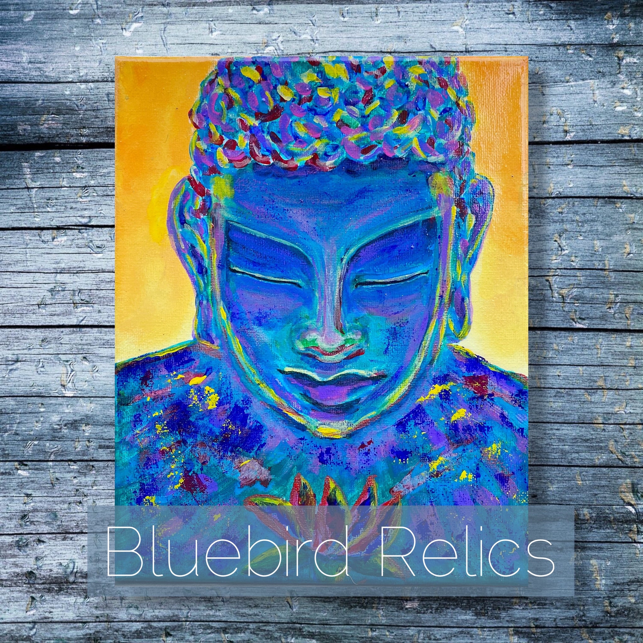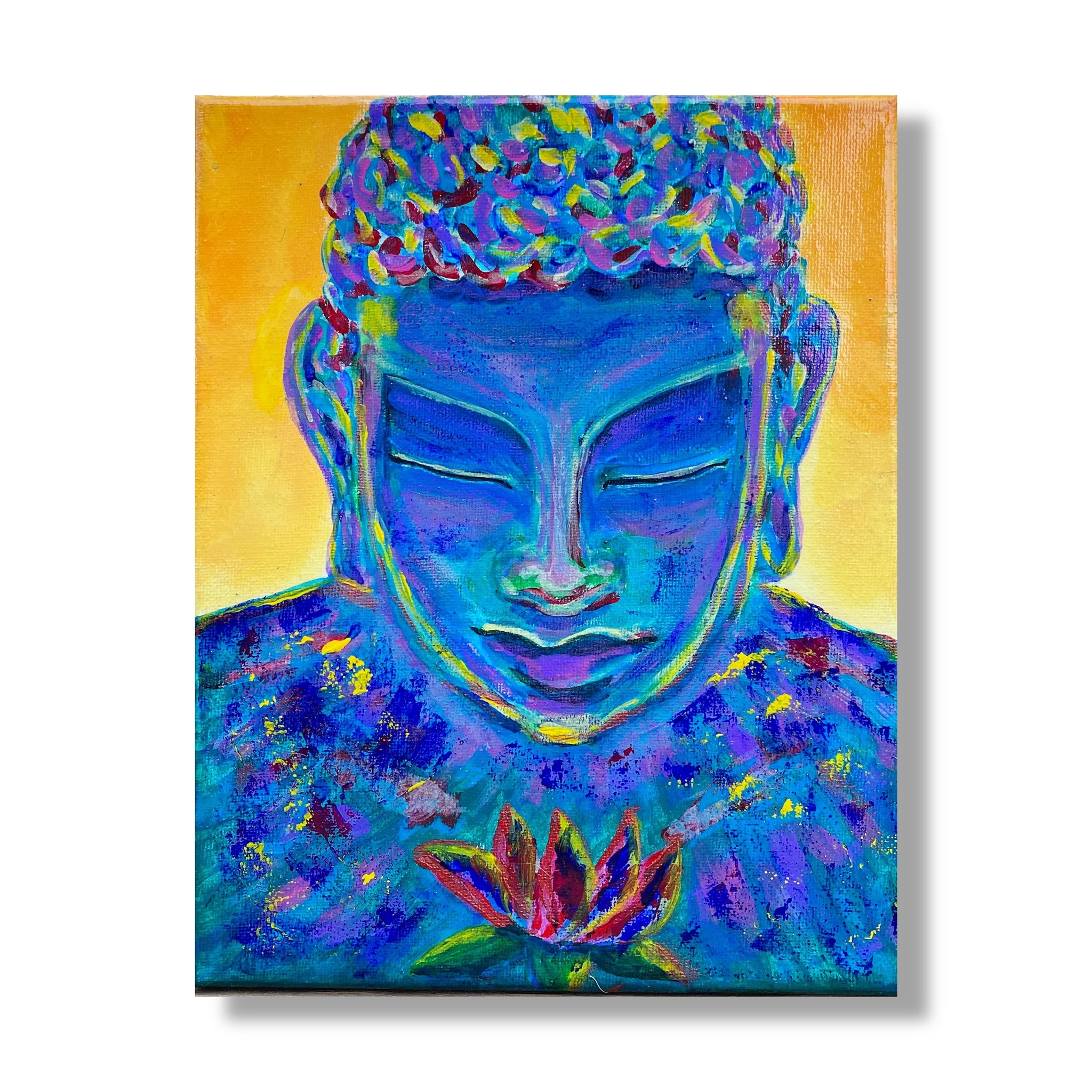 A vibrant portrayal of a Buddha in meditation, captured through a spectrum of vivid colors. The Buddha's head, adorned with a crown of multi-colored petals, exudes a sense of calm focus. The face, painted in shades of tranquil blue, contrasts with the warm yellow background, symbolizing a union of peace and enlightenment. Splashes of color across the robe resemble a cosmic nebula, suggesting the Buddha's connection with the universe. At the heart of the painting, a radiant lotus flower in full bloom anchors the composition, representing purity and spiritual awakening. This artwork is a celebration of spirituality through the dynamic use of color and texture, inviting contemplation and inner harmony.
