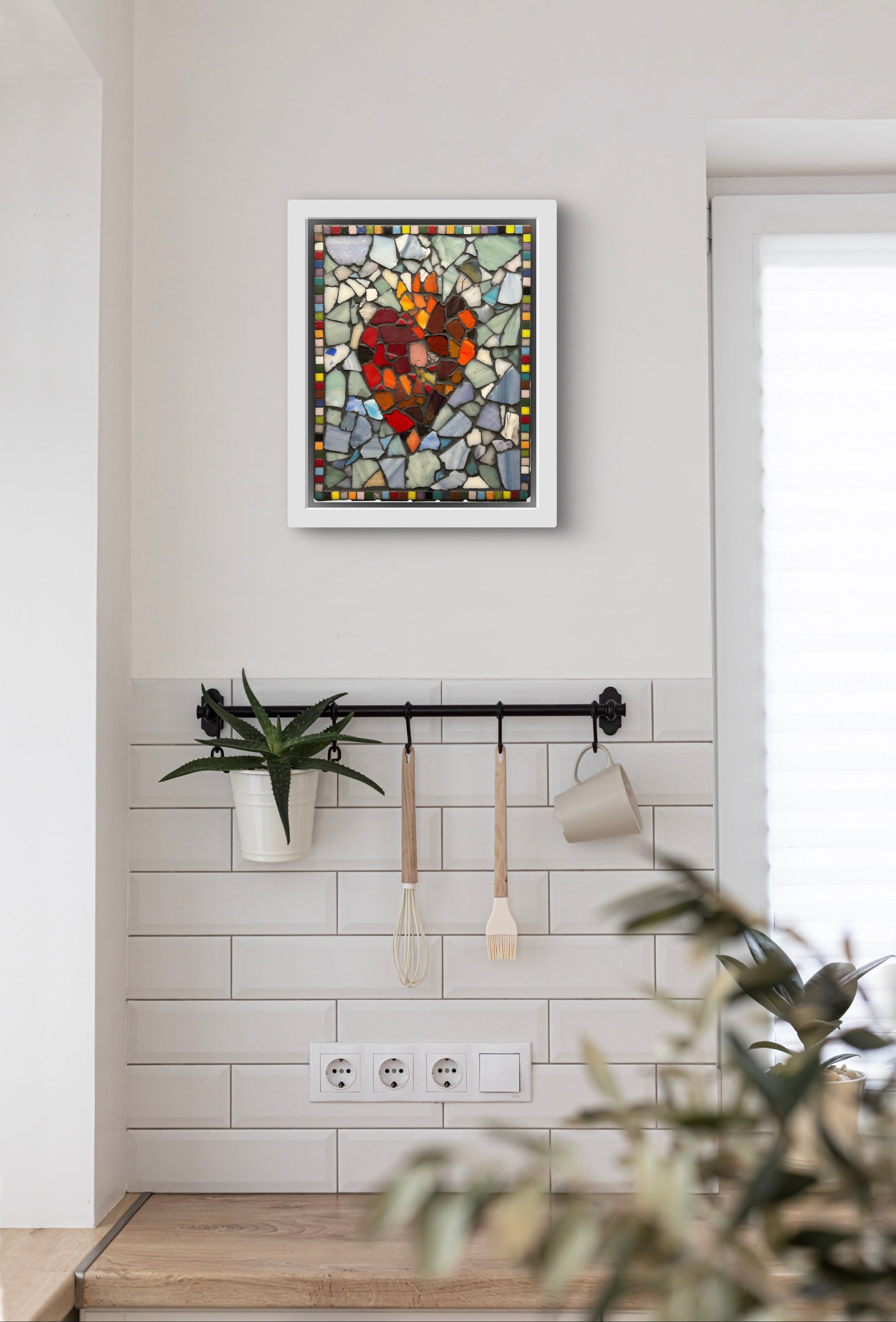 Every shard tells a story, each fragment carefully placed to honor the beauty found in imperfection. The radiant heart emerges from a tapestry of soft blues and greens, its edges framed with a joyful mosaic border that dances with color.